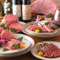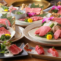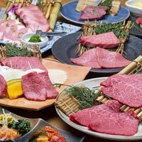 黒毛和牛の最上級厳選希少部位を使用した贅沢な焼肉コース。(肉総量290g)厳選した最高級黒毛和牛A5ランクのお肉を、熟成(ウエットエイジング)管理し、コース仕立てでお出ししています。前菜から始まり、流通量の少ない黒毛和牛のタン、焼きしゃぶ、炙り寿司、シャトーブリアンステーキ、トリュフ握りとたまごソースで食べる焼きすき、希少部位のタレ焼き、極上ハラミ、〆の牛茶漬け、季節のデザートなど記念日や接待でのご会食向けの贅沢なコースです。 ※当日の入荷状況によりメニューが変わる場合がございます。