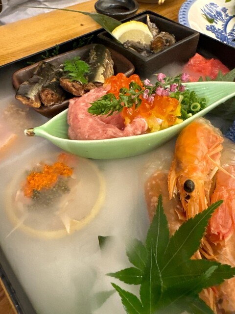 47都道府県の日本酒と通常の飲み放題が付いた、まさに「日本を味わう」ような贅沢なコースをいただきました。 【造り盛り合わせ】 お刺身5種は、どれも肉厚で新鮮そのもの。脂ののった魚、歯ごたえを楽しめるもの、どれも違った美味しさがあり、一皿で多様な味覚が楽しめました。 【名物・玉手箱】 ... 詳細を見る