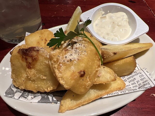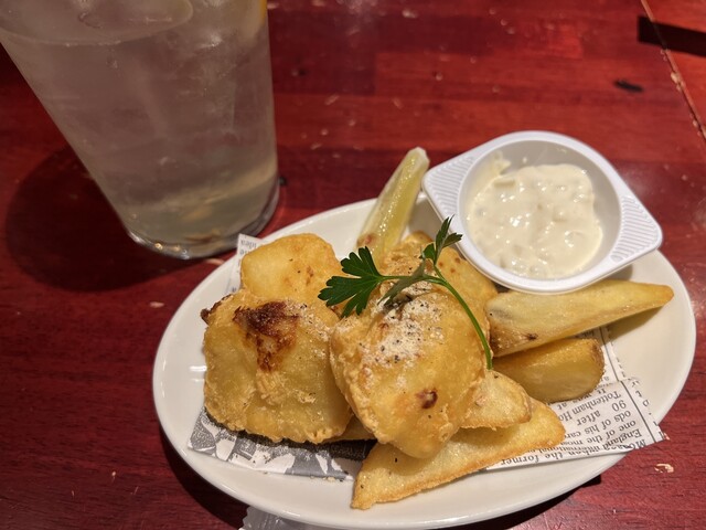 一杯目はギネスビールをいただきます。久しぶりのギネスですが、クリーミーで泡もきめ細かくて◎。食べるものは友人におまかせ♪ フィッシュ&チップスとソーセージの春巻き?のような一品。