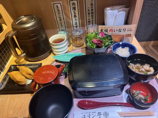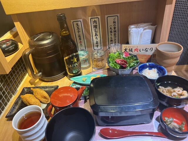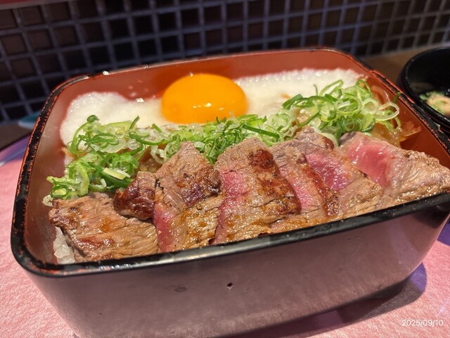JR大阪駅、桜橋口改札を出てすぐ、エキマルシェ大阪内にある、カウンター席のみの肉重屋さん。 勤労感謝の日の午後1時半に訪れたが、4組待ちの列。だが回転は速く、10分程度で着席。 ・ハラミ&肉飯重 単品 1,320円 ・ロマン亭錦重 お膳セット 1,480円 錦重は、ビフテキと肉飯、二種の盛り合わせ。 肉飯は、いわゆる牛丼だが、煮込んだ玉ねぎの上に和風だしの効いた牛白焼きを乗せた... 詳細を見る