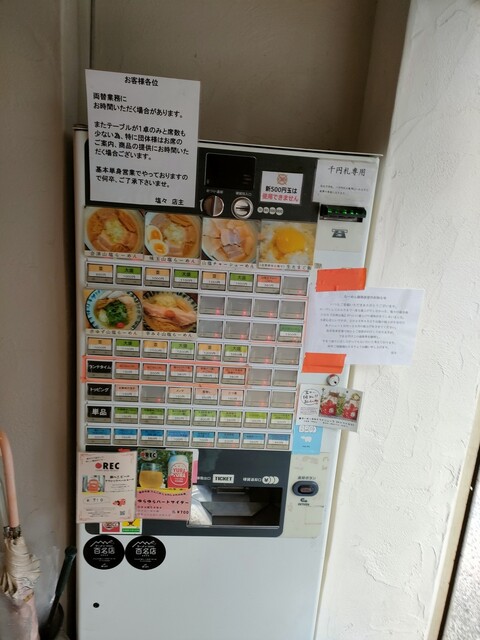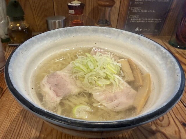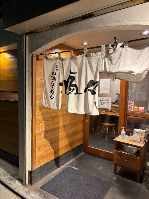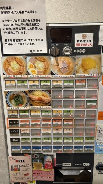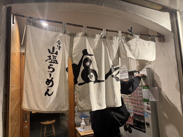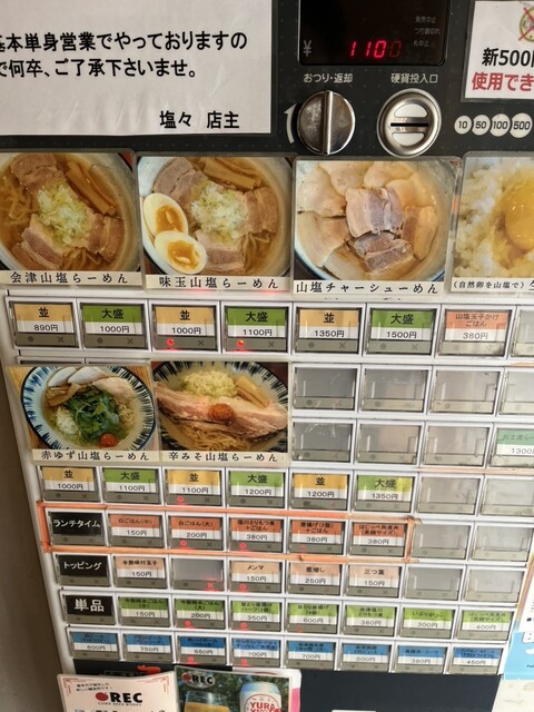 福島エリアに構える塩ラーメン専門店。券売機には「会津山塩らーめん」「味玉山塩らーめん」「山塩チャーシューめん」などが並び、山塩を軸にした構成。今回は山塩チャーシューめんを注文。
