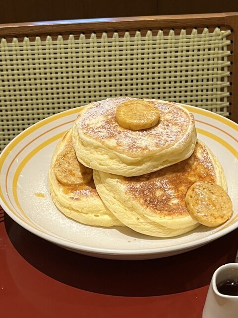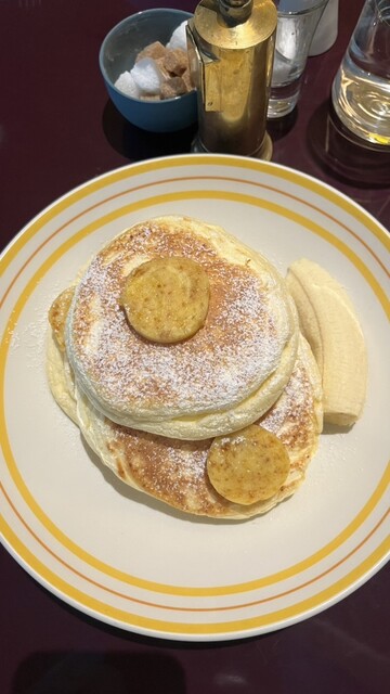 3枚重なっていて、上にはバター、お皿にはバナナが一緒に乗っていました。