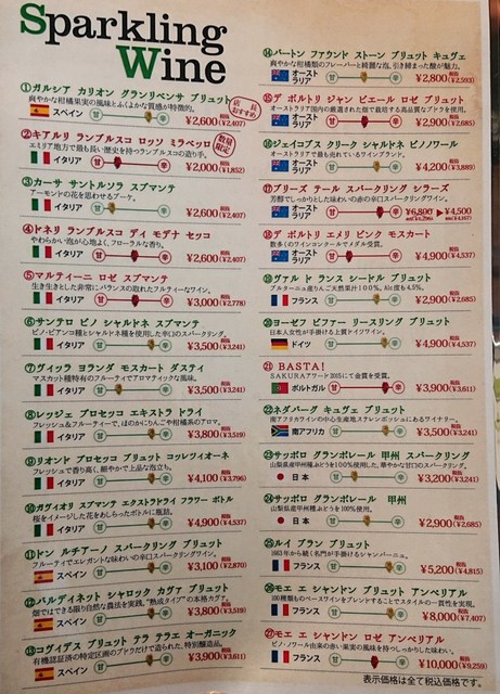 スパークリングワインのメニュー表を見ましたが、27種類もあって驚き!