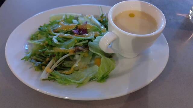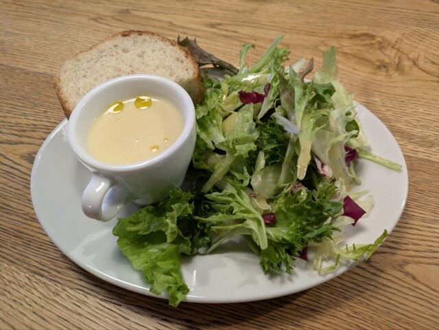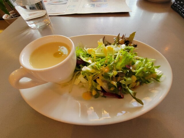 サラダ、コーンスープ、フォカッチャも付いてきて...