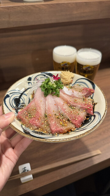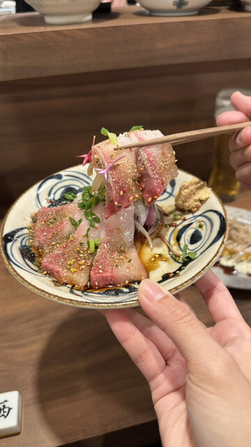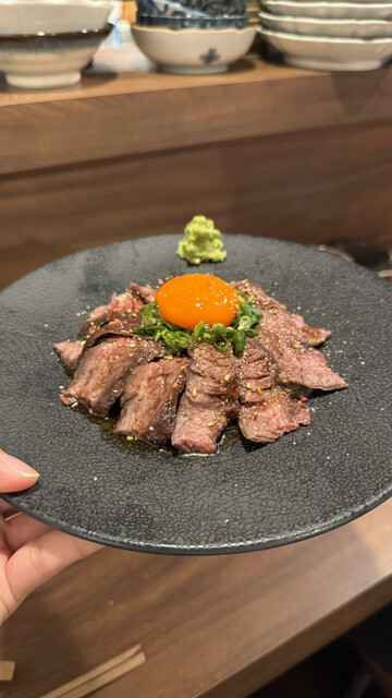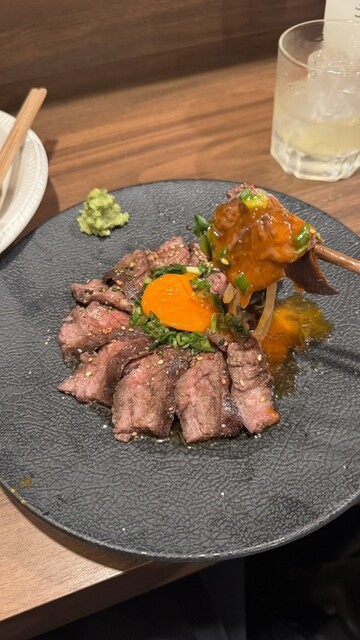 「牛ハラミたたき」は肉質が柔らかく、卵黄を絡めるとさらに濃厚な旨みが広がりました。