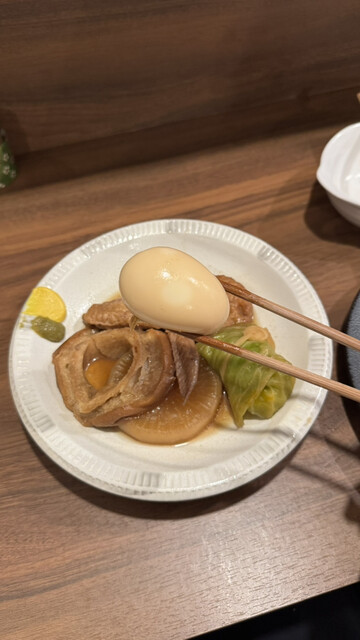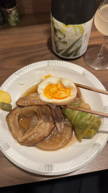 「おでんの6種盛り」も出汁が優しく、特にロールキャベツと車麩は印象的でした。