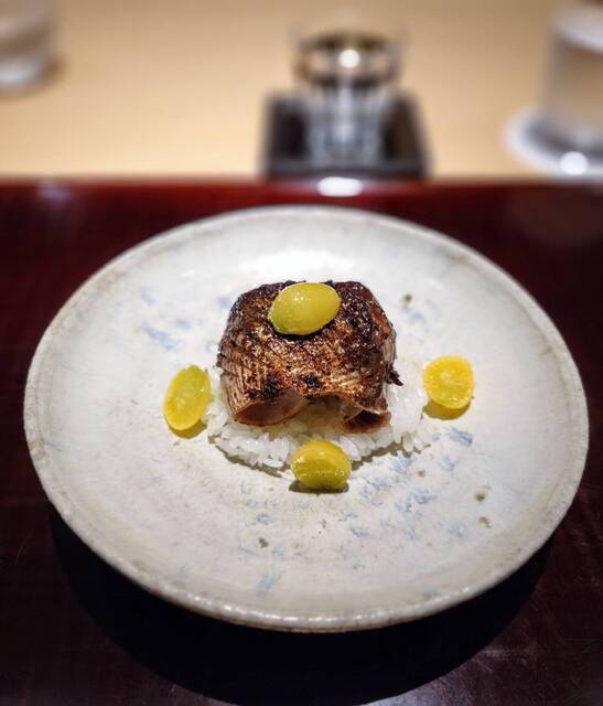 秋刀魚おこわ肝焼き銀杏添え