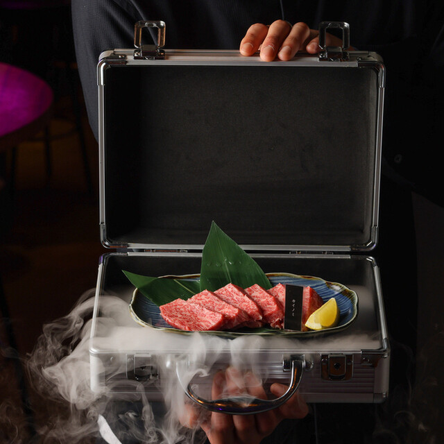 食べ放題プランは4,500円〜8,500円まで幅広く、先出しのジュラルミンケース演出からテンションは最高潮。煙の中から現れる肉はインパクト抜群です。