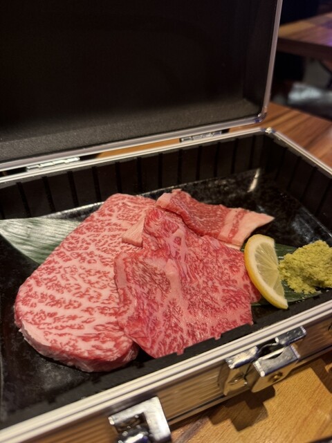 お通しとしてジュラルミンケースに入ったお肉が登場
