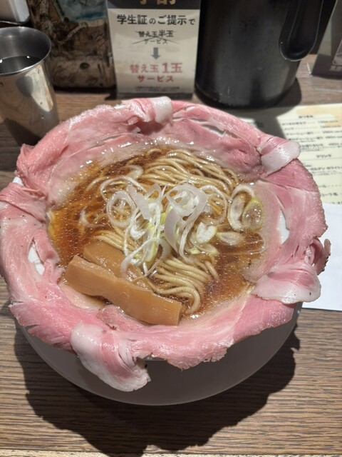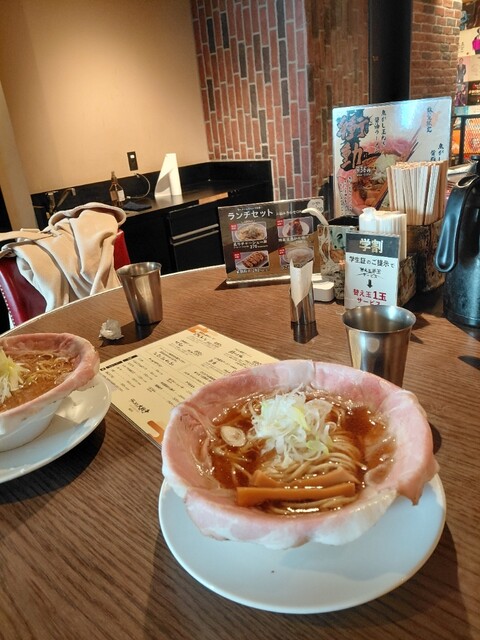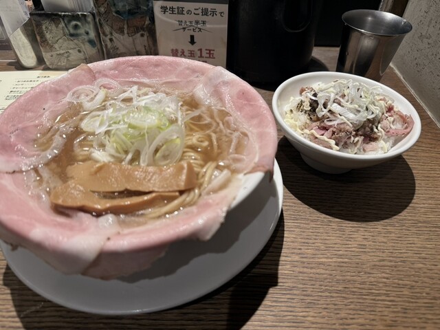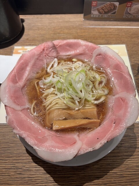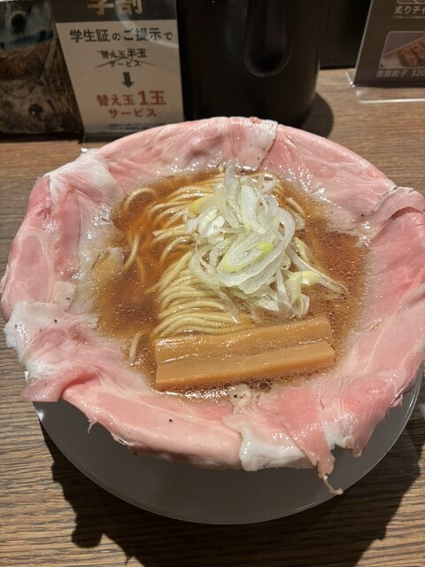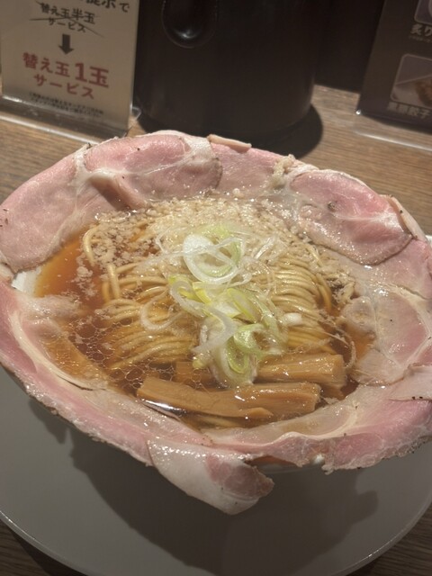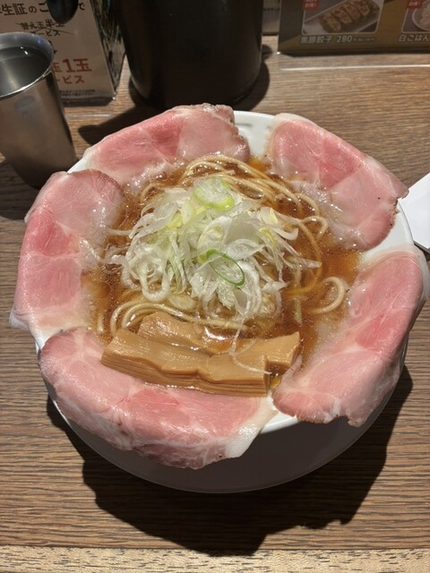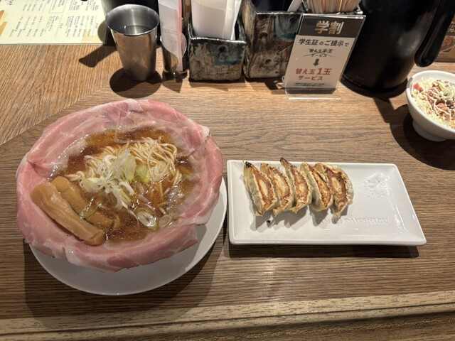 関西だし醤油ラーメンのピストルチャーシュー5枚と黒豚餃子、後から追加で半玉無料の替え玉を注文しました。ランチメニューで黒...