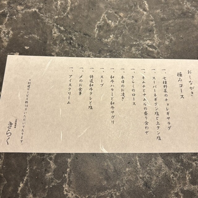 人気メニュー/特選ロース、和牛釜飯、スーパーネギタン塩、きらくのタン、サーロイン焼きしゃぶ、シャトーブリアン、神のハラミ、サガリ、ロース、赤身和牛盛り合わせ、上ミノ、ハツ、キムチ、もやしナムル、石焼ビビンバ、わかめスープ、すだち冷麺、極みコース、特選コース、バニラアイスなど