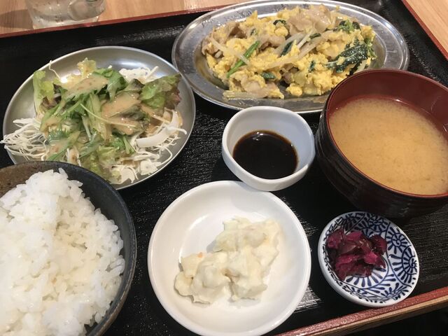 そうして頼んだポパイ定食は一番最初に登場。野菜サラダにポテトサラダ、ほうれん草豚肉もやし玉子いため、ご飯、漬物、みそ汁、そして謎のソースが付属している。玉子いためはいい火の通り具合でいいお味。