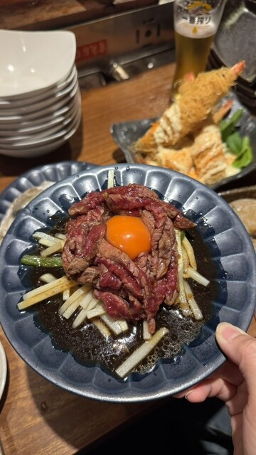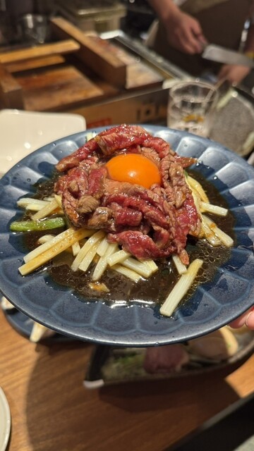 イチボを使った「生チンジャロース」は卵黄を絡めて食べると濃厚で、ピーマンや筍の食感との組み合わせも良いバランス。