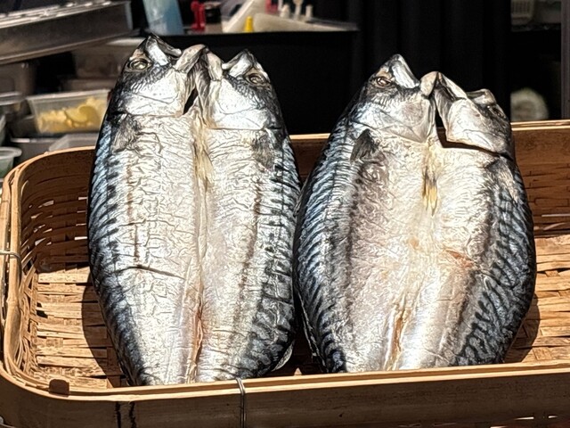 炭火で焼かれた鰯はパリッと香ばしく、見たことないくらい大ぶりな明太子がのってる