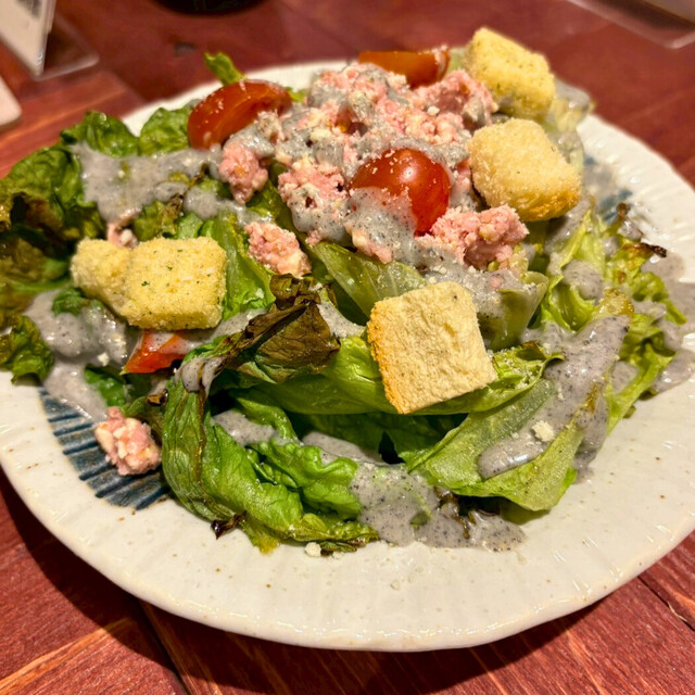 炭焼きされた香ばしいレタスに、黒いシーザードレッシングの組み合わせ。これ美味しかった!