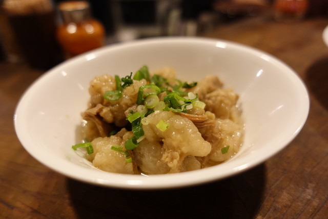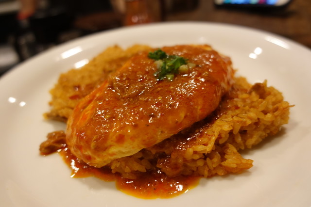 夜は立ち呑みの店が、昼はカレー屋に顔を変える。つまりは立ち食いカレー屋。出されたカレーは「え? ハヤシを注文したっけ」な赤いソース。表の看板には、水を一滴も加えずにトマトとヨーグルトで作ったチキンカレーとある。トマトの酸っぱさと甘さが凝縮されて、カレーというよりむしろイタリアン。チキンはかなり煮崩れて味に奥行きを出している。これはもう、カレーを超えた何か別の料理といってもいいのだが、スパイスの香り...はしっかり際立っているのがお見事。チキンカレー大盛630円、持ち帰りは並500円・大盛550円、夜のみチキンカレーリゾット480円