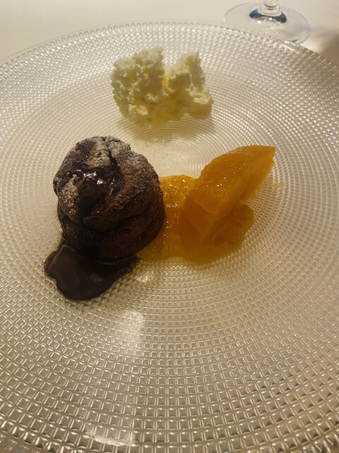 ドルチェは数種類の中から選べて、私はフォンダンショコラ的なものに柑橘のソースとマスカルポーネ添え 柑橘は紅まどんなでした