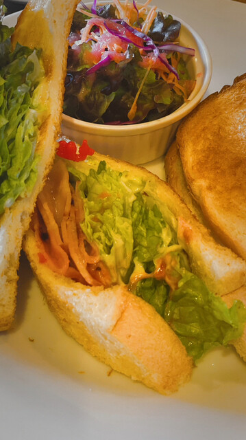 スパイスカレーセットで、サラダにアイスコーヒーです。スパイスカレーはスパイス香る程よい辛さの美味しいやつです。チキンもホロホロ肉で美味しい。サラダもドレッシング含めて美味しいし、アイスコーヒーも美味しかったです。