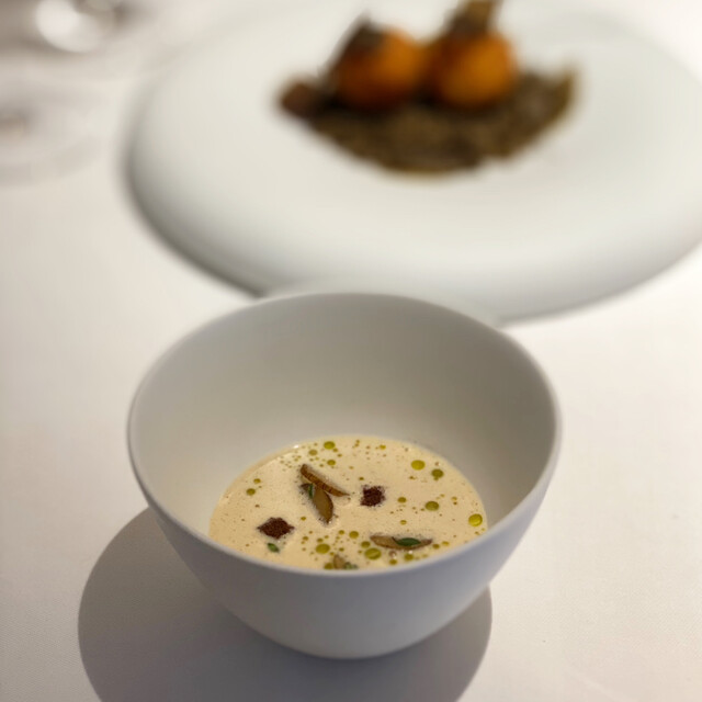 いつも通り予約をして2人で伺いました。食前酒はシャンパンで乾杯です。一品目は秋刀魚のお料理ですが見た目はわかりません。食べると秋刀魚の味がしてなるほど思う感じです。次々に出てくる他のお料理も素材の原型はとどめていませんが、それぞれに美味しいですね。今回のお料理では甘鯛の料理が一番おいしく感じました。... 詳細を見る
