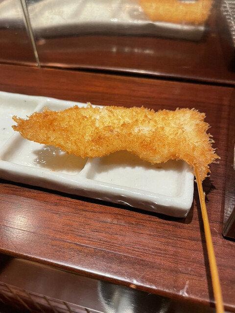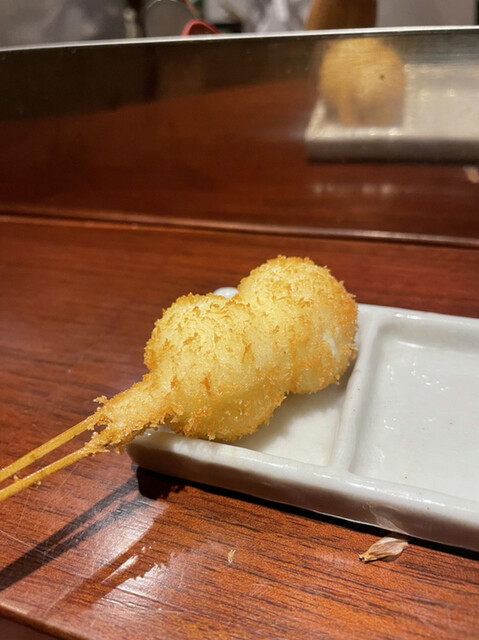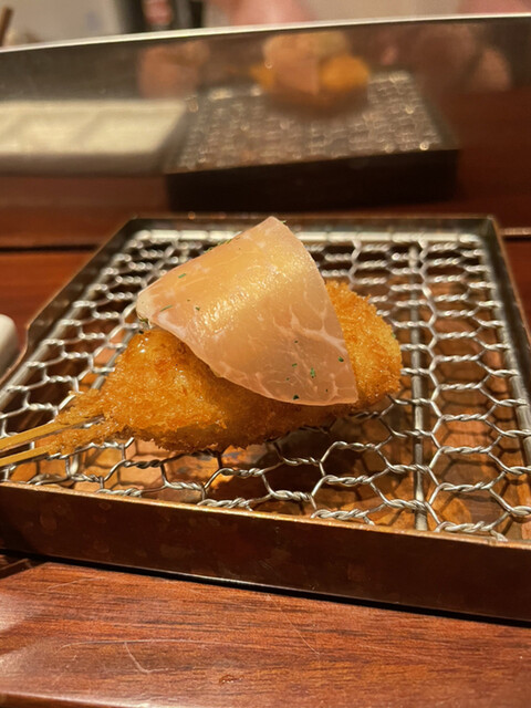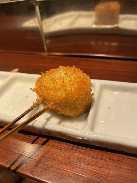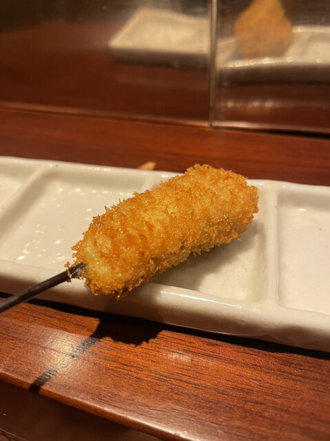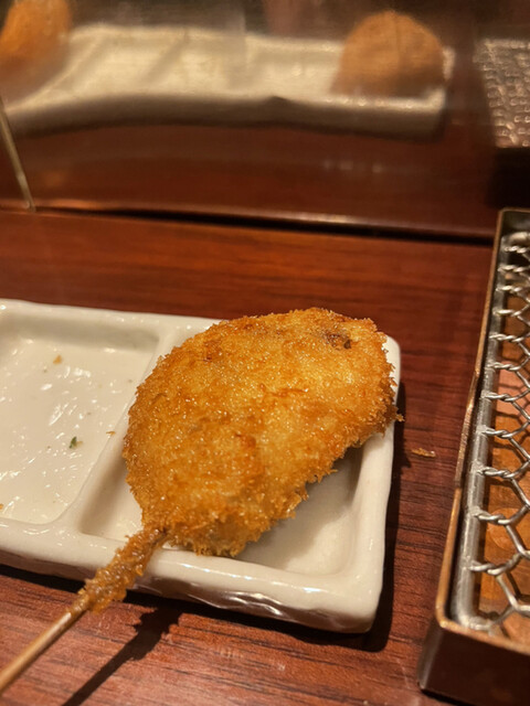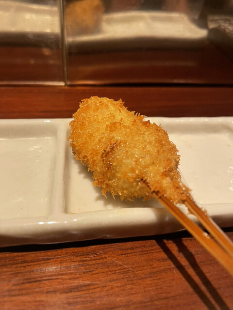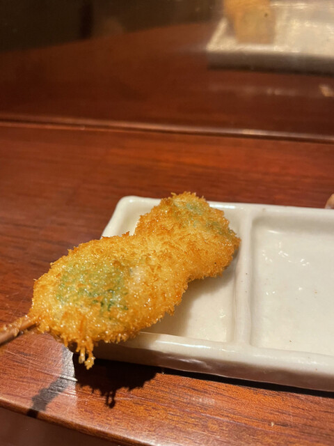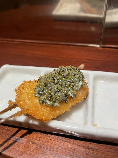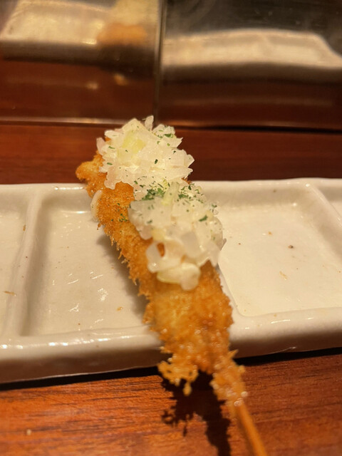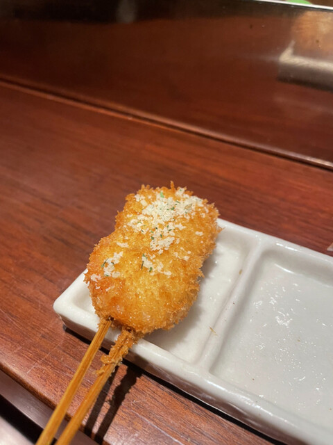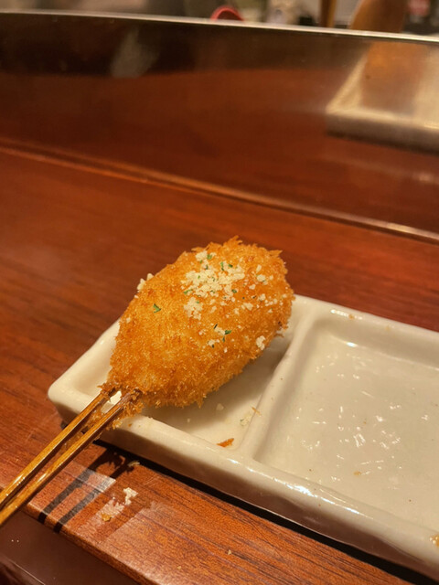 【メニュー創りには一切妥協しない】一本、一本研究を重ね、試行錯誤を繰り返しています。こだわり抜いた創作串をご堪能下さい。また、食材は毎朝仕入れているから鮮度抜群です。そして、当店の衣は一般的な物と比べて軽く、胃にもたれにくい。あっさりとした味わいとサクサクの食感をお楽しみ下さい。一口サイズなので食べやすいのも特徴です。ぜひ一度食べて頂きたいのが【トマトのおでん風】プチトマトの中にミンチが入っており...、お召し上がりの際は串から抜いて鰹と昆布のおだしに入れてどうぞ。初めての味に驚いて頂けるはず。自慢の自家製つけだれはバリエーション豊富な5種類。抹茶塩・出汁醤油・合わせポンズ・マスタードソース・黒ソースとご用意しております。お酒はワインを中心に取り揃えており、20種類以上の品揃え。串はワインに合うようにお作りしているので相性抜群です。
