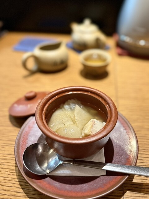 オスとメスの上海蟹紹興酒漬けの食べ比べからはじまります。フカヒレの煮凝りが添えられてたりしますが、上海蟹とフカヒレって相性良いかと。