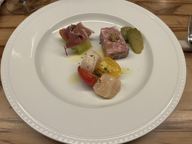 本日の前菜3種盛はホタテとフルーツトマトのマリネ、豚肉のパテとピクルス、生ハムメロンです。