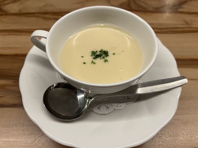 シャトーブリアンのスジ等を使用した牛だしで、メークインを滑らかなポタージュスープです。