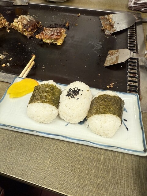 名物の千草焼きに牛すじモダン、牡蠣の鉄板焼き、焼きそば、おにぎりをオーダー!
