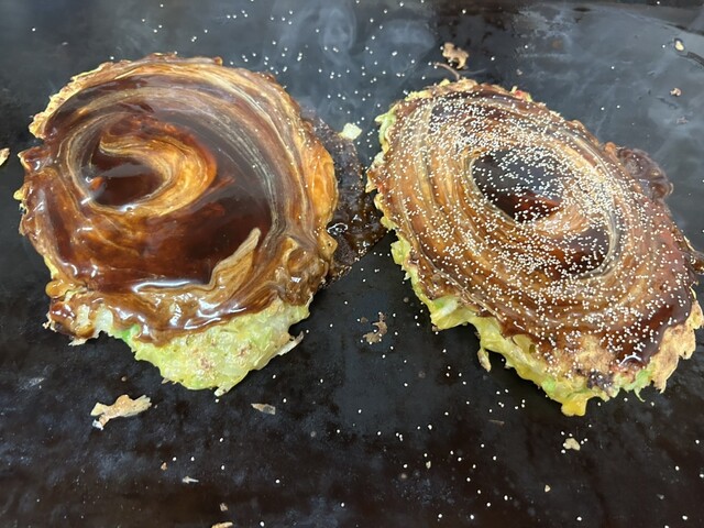 いやなんでこれが並ばんでいけるんや…しかも名物千草焼き(写真右)は店員さんが生地混ぜて焼いてくれるスタイルやのに…