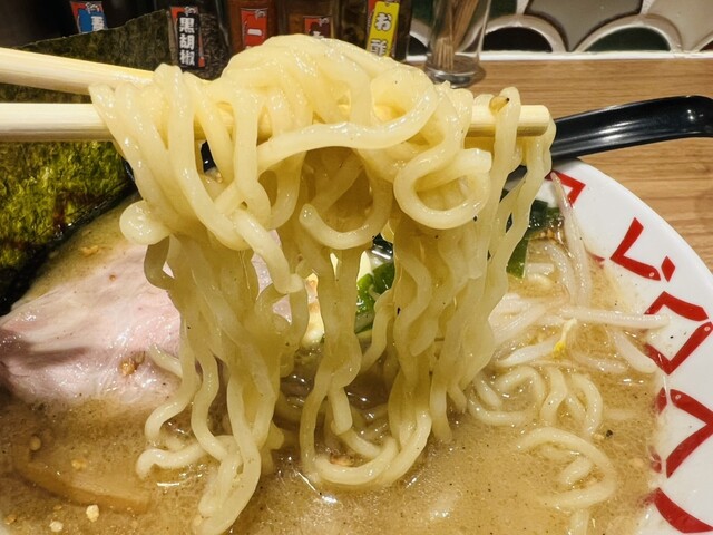 厳選された煮干し出汁とクセのない豚骨のWスープはちぢれ麺との相性抜群!!