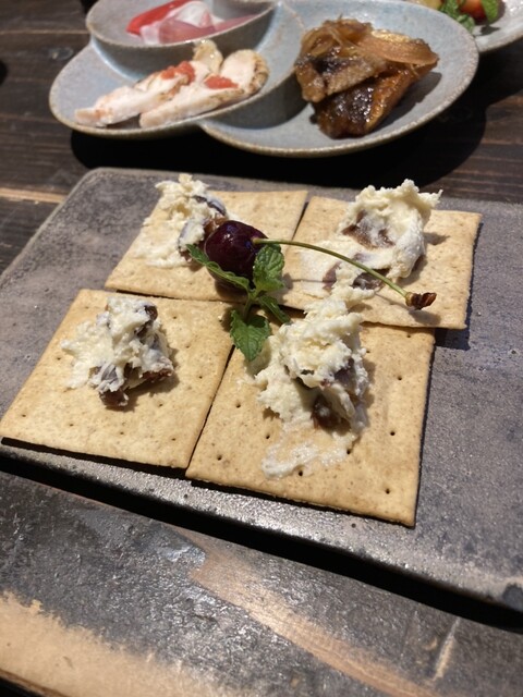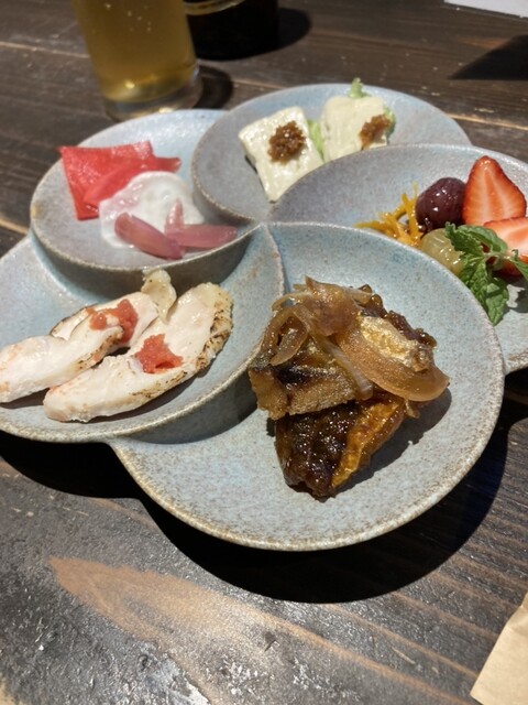 前菜三種盛りが運ばれてくる。カマンベールの味噌乗せ、鶏モモ焼きのかんずり乗せ、鯵南蛮に、いちごをはじめとする季節の果物、赤蕪などのスライスの五種盛りになっている。メイン三種は、いずれも酒が進むものはかり。後の二品は箸休めにちょうどいい。