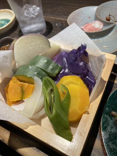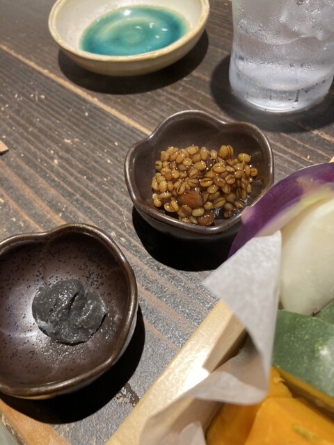 蒸し野菜は、南京、ズッキーニ、玉葱、万願寺とうがらし、人参、芋、紫菜の七種を蒸したもの。これを金山寺味噌や黒塩麹に付けて頂く。蒸すことにより、それぞれの野菜の旨味が凝縮され、甘味が引き出され、とても美味しい。また、金山寺味噌だけでも飲めてしまう。