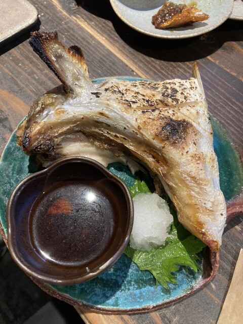 カマの塩焼きは、縞鯵とのこと。まずはそのまま頂く。柔らかな塩味と程よい脂の乗った身は、ほっくりしてしていて、旨い。かんずりポン酢に付け、大根おろしを乗せて頂くと、雑味が一切なくなり、旨味だけが広がる。酒にも米にも合う。ボリュームもあり、値打ち高い一品。