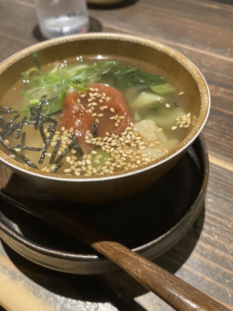 かなり飲んだところで、連れが梅茶漬けを注文する。運ばれてきたのは、いわゆる出汁茶漬けとのこと。味わい深い出汁に、梅の酸味が滲み出て、爽やかかつ旨味たっぷり。一口頂いたが、これで充分に酒が飲める。