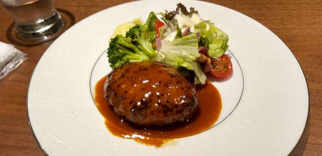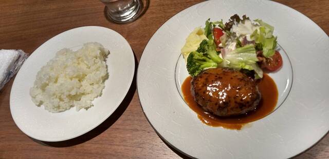 黒毛和牛のyハンバーグはサラダも一緒に大きなお皿に乗っていました。