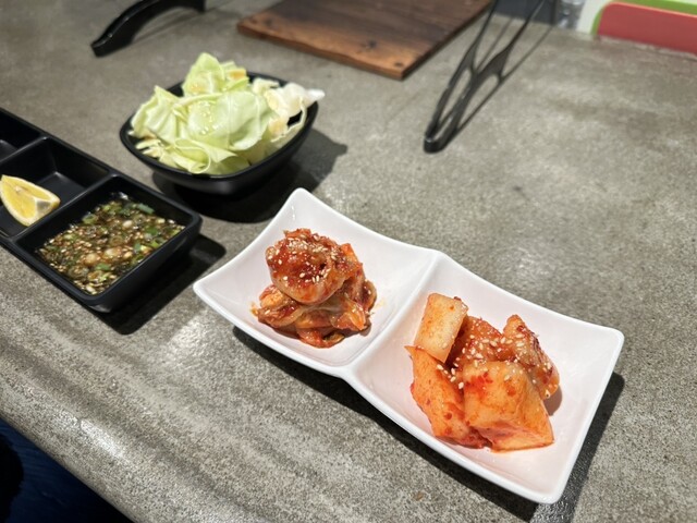 今回のオーダーは、塩タン、ハラミ、赤身、ステーキ(マルシン)、ユッケ、マルチョウ、キムチ2種(白菜、大根)です(・∀・)