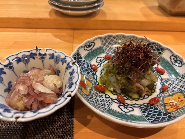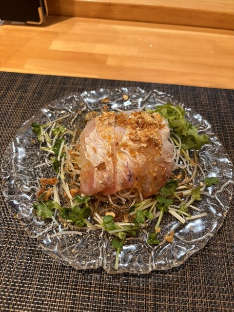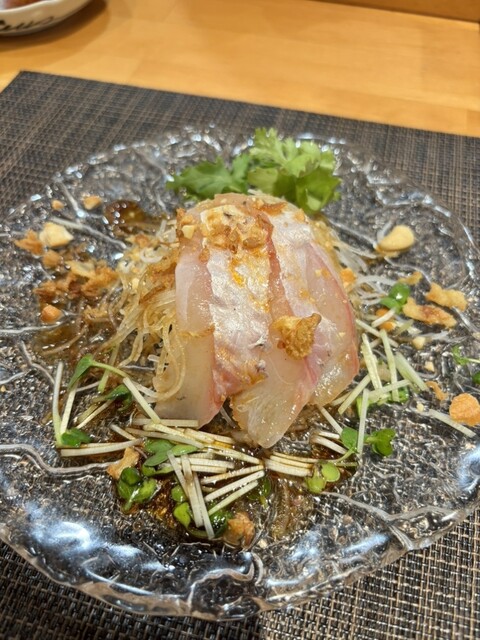 平日の夜に予約して訪問しました。 予約で満席のようで、飛び込みのお客さんは断られてました。 1人でも頼めるハーフコース(3,850円)に焼売1個(440円)を追加で頼みました。 まずは前菜3種。 盛り合わせではなく、1皿ずつ3皿提供してもらえます。 1皿目は真鯛の広東風カルパッ... 詳細を見る