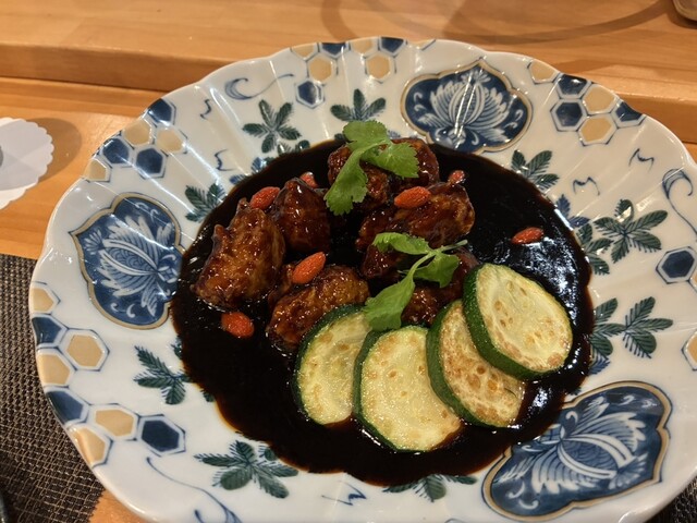 黒酢の餡が美味しすぎて店主の方に無理を言ってズッキーニを追加で焼いていただきました。