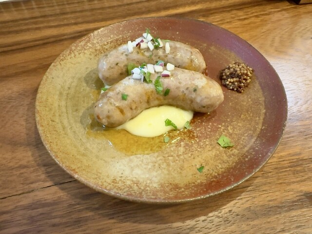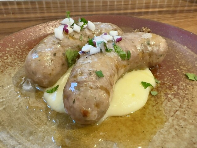 自家製サルシッチャは石見ポークの肩ロース肉をミンチにして作っているそう。みっちり詰まった肉身はジューシーかつパワフルに甘くて、混ぜ込んだハーブの香りも利いていて、下に敷かれたシルキーな口当たりのじゃがいものピューレが間...