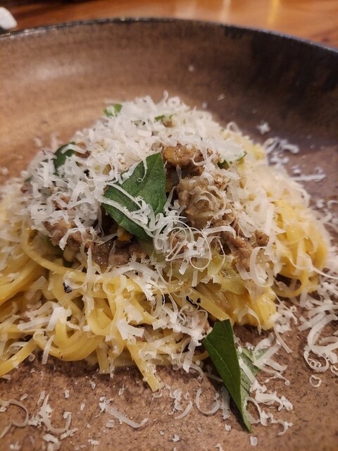 ちょこちょこ楽しめてお酒の進む前菜盛合せをはじめフリットもパスタも何を食べても美味しかったが、今回出色だったのが自家製サルシッチャ。