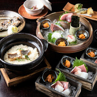 信楽焼の土鍋で炊き上げる鯛めしを〆に召し上がっていただくコースです。その日に仕入れた新鮮な魚介と季節の食材を堪能できます。内容は予算(8,000円~10,000円)に応じて変更可能です。刺身が豪華になったり、金目鯛やのどぐろなどの高級魚を使用したりお肉料理を含めたりすることができます。お気軽にご相談ください。