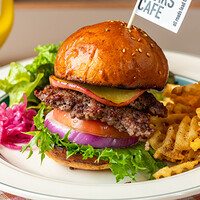 スタイリッシュでおしゃれな空間のカフェ。当店の看板メニューは、自家製全粒粉バンズに、ジューシーな和牛入りパティと香ばしく焼き上げた焼きリンゴを挟んだ、NYスタイルのこだわりハンバーガー。ランチはもちろん、こだわりのドリンクも充実し、カフェタイムはデートや女子会にぴったり◎アクセス抜群な駅近で、貸切や大人数利用もできます。