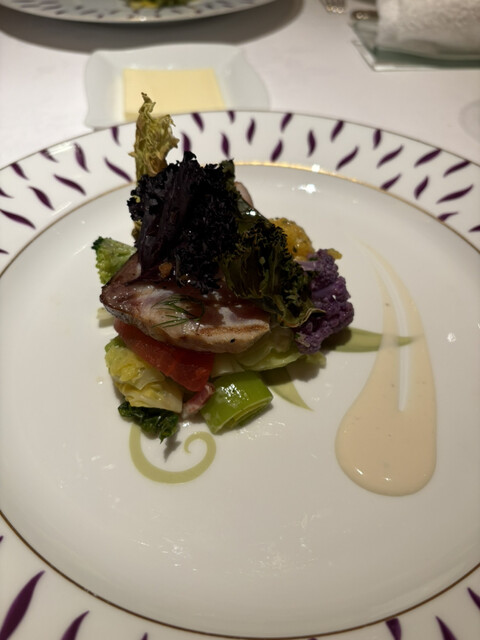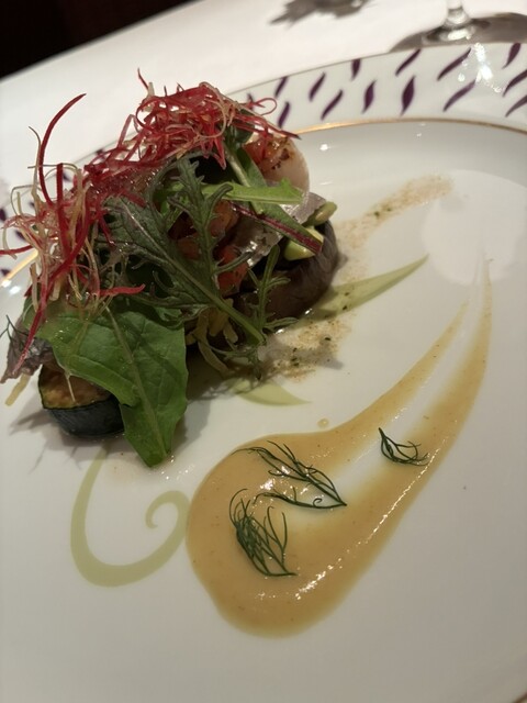 予約をして2人で伺いました。食前酒で乾杯です。いつものようにスプーンに盛り付けられたスープコロッケが出ました。定番のお料理ですが美味しいです。最初のお料理は鯖でした。色々な野菜とまじりあっています。鯖...