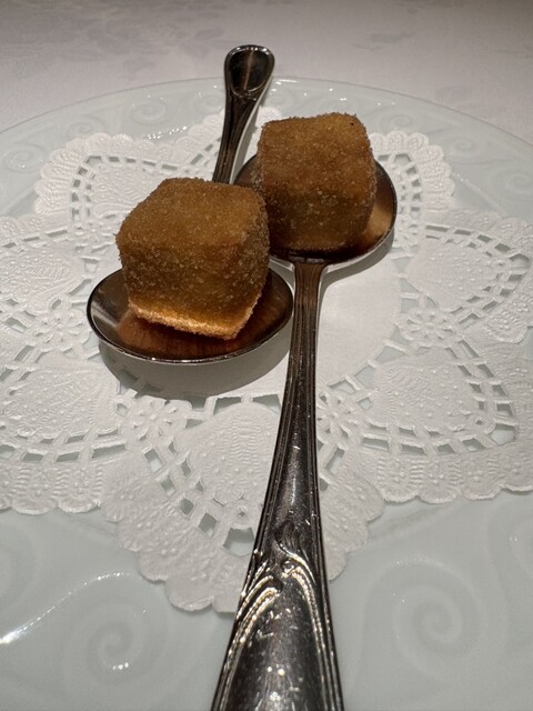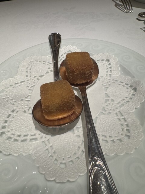 コースの説明を頂き、まず1品目の一口サイズの料理に驚き