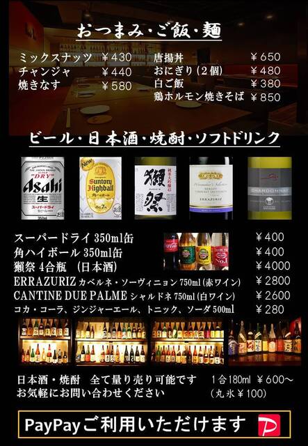 | ドリンク | 日本酒あり、焼酎あり、ワインあり、カクテルあり |