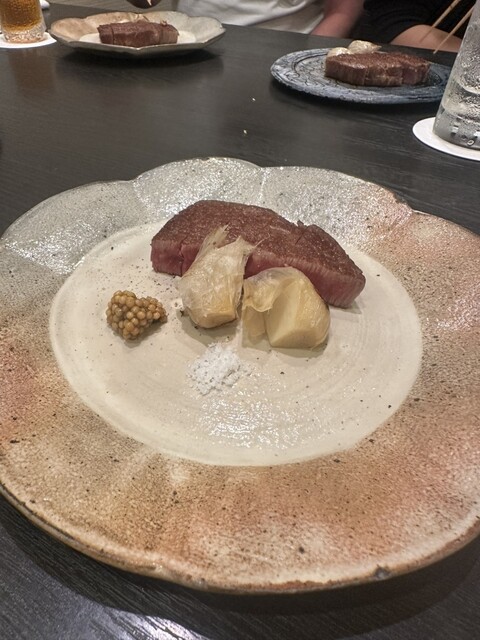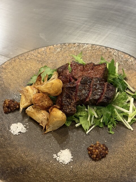 絶妙な焼き色の肉に、こんがり焼かれた丸ごとニンニク。土の温もりを感じる器が、素材の良さを一層引き立てています。職人技が光る極上のステーキを堪能できる、まさに五感で味わう至福のひとときと言えるでしょう。