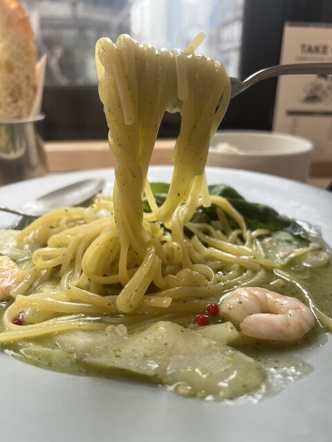 店内に製麺所が併設されており、保存料不使用の生パスタを提供されています。 製麺機で作られたパスタはもちもちとした食感で、小麦の風味と自然な甘みが感じられました。 メニューは種類が豊富でどれもおいしそうなので選ぶのに迷うほど。 今回は人気No.1の「海老チーズトマトクリーム」を注文しました。... 詳細を見る
