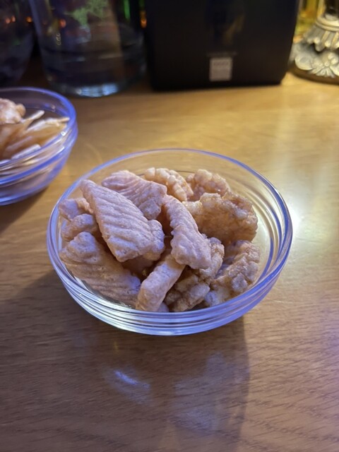 映画を観ながら、まずは綺麗色のカクテル、パリジャンをアペリティフに、チャームのお菓子をつまみます。