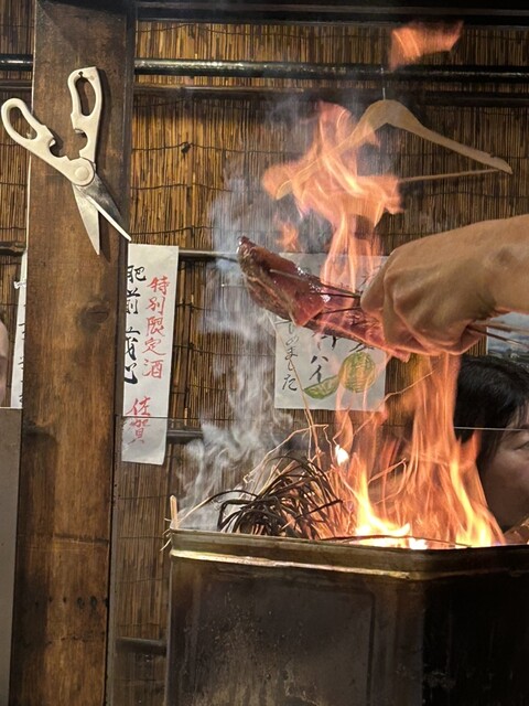大阪本町近くにある「番屋 燁(バンヤ ハナ)」は、藁焼きと炭火焼きをメインにした居酒屋で、店に入った瞬間から活気ある雰囲気が漂っています。カウンター席に座ると、目の前で店主が藁で魚を豪快に焼き上げる様子が見られ、その炎の迫力には圧倒されますが、手際の良い職人技に見とれてしまいます。
