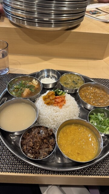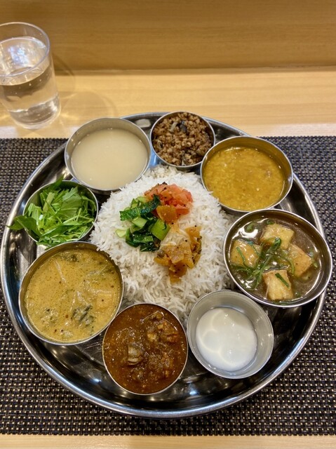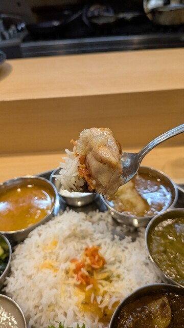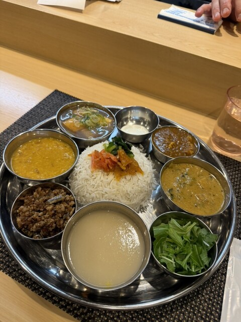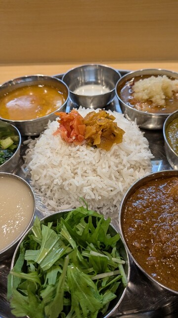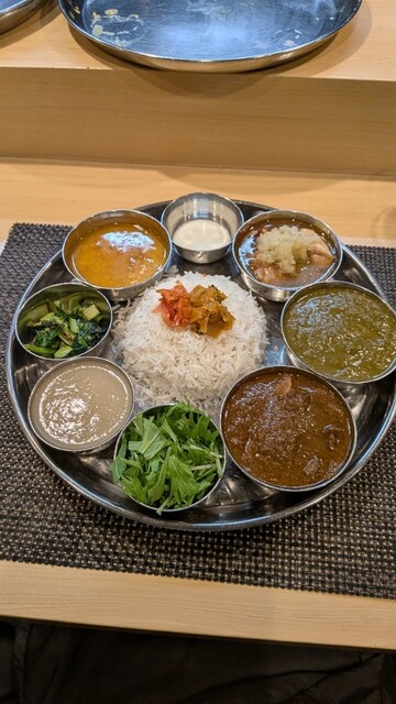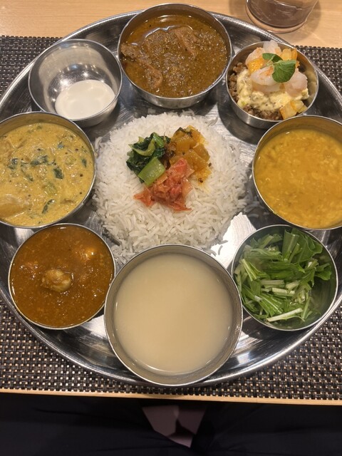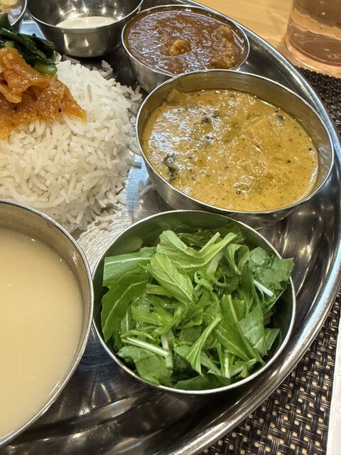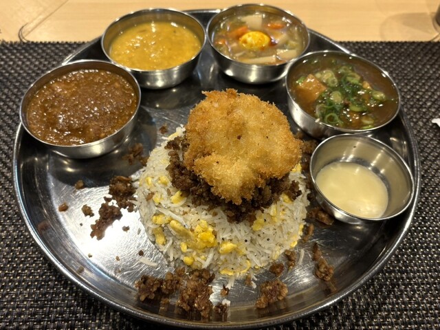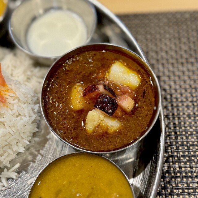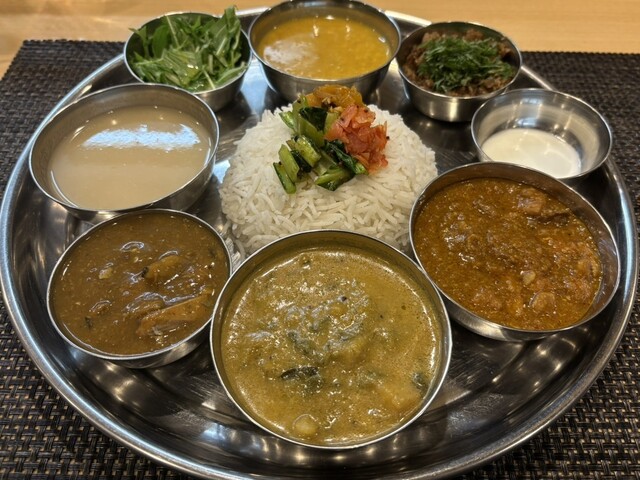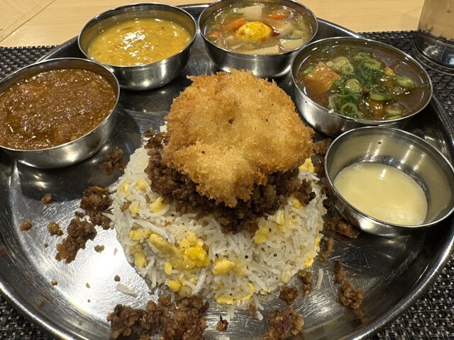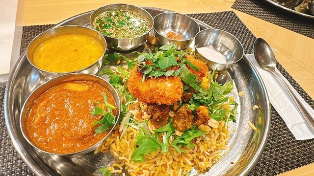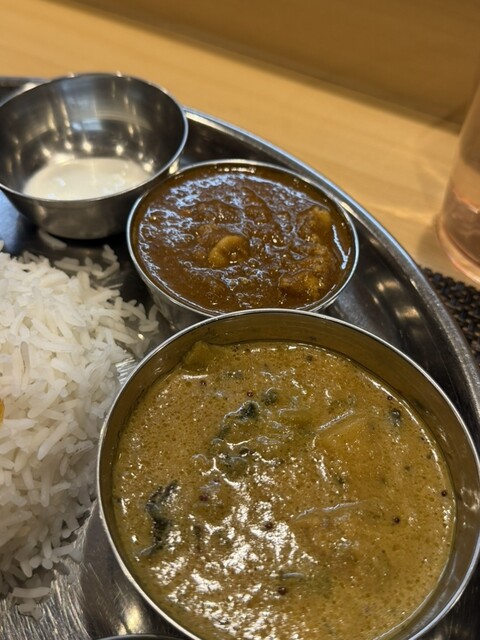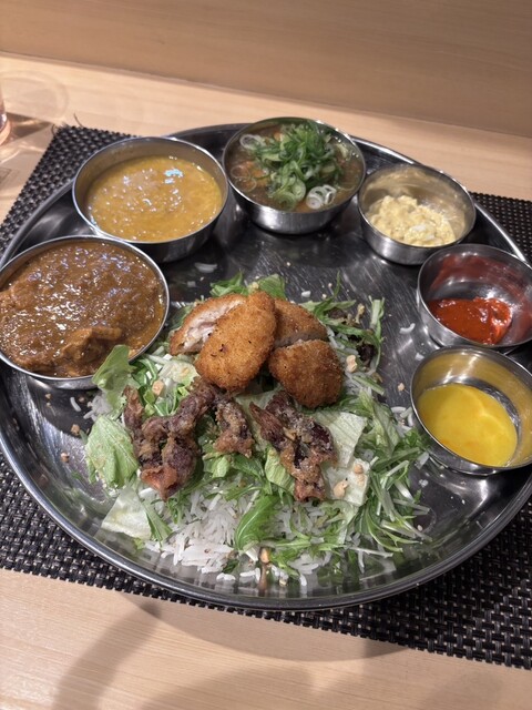 ・南インド風のプレートに、白いご飯を中心に複数の餡掛けカレーが並び、見た目も華やかです。2種類の餡掛けはそれぞれ個性的で、スパイスの香りが豊かでおいしかったです。カツも揚げたてでサク...